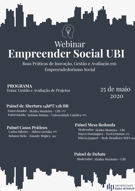 A convite d@s alun@s da turma do 1º ano do Mestrado em Empreendedorismo e Inovação Social, da Faculdade de Ciências Sociais e Humanas da Universidade da Beira Interior – Portugal estão a organizar um Webinar, denominado por EMPREENDER SOCIAL UBI: boas práticas de inovação, gestão e avaliação em empreendedorismo social, iremos participar na sessão a distância. O evento tem como proposta a realização de sessões on-line, durante a tarde dos dias 25 e 26 de maio de 2020, aberto ao público nacional e internacional.